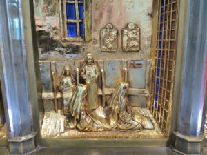 C’est un peu étrange pour moi de demeurer près d’un reliquaire, je n’ai pas particulièrement ce genre de dévotion, c’est peut-être même la première fois que je me recueille ainsi près d’un tel objet. Finalement, son contenu m’importe moins que le sentiment touchant de me trouver dans l’église où Elisabeth priait et communiait dans une grande ferveur. Sa présence est là, palpable. C’est le moment de solliciter son intercession, au milieu d’autres pèlerins d’un instant qui viennent en cet endroit pour faire mémoire d’elle. Les bas-reliefs soigneusement dorés qui ornent la châsse représentent différentes scènes bien connues de la vie d’Elisabeth Catez, de son baptême à sa mort si jeune. Tableaux émouvants de l’existence toute simple et donnée au Seigneur de cette jeune fille au caractère entier.