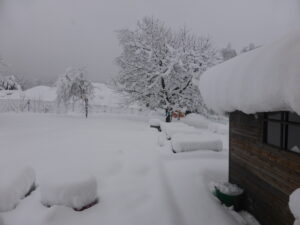 Je n’ai qu’un chauffage électrique et la maison se rafraîchit peu à peu. S’habiller chaudement et attendre le jour en comatant un peu sur le canapé. Il est encore tombé autant de neige cette nuit qu’hier, la couche sur la terrasse est très impressionnante. Et ça tombe jusqu’à 10h environ.