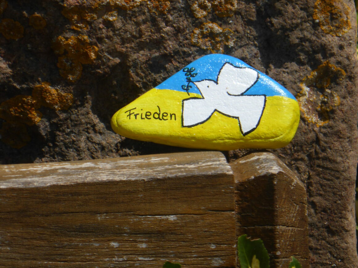 Nous partons à la découverte du site, par les rues calmes du vieux village brûlé d’un soleil têtu. Nos pas nous mènent à la belle petite église paroissiale romane. Emotion de découvrir la sépulture toute simple de frère Roger dans le cimetière autour de cette église, elle est recouverte de végétation un peu folle et on ne la distingue de celle des autres frères que par l’inscription “Frère Roger” sur l’humble croix de bois, et par un petit caillou peint d’une colombe avec l’inscription “Frieden” (paix) qui est simplement posé là, sur la croix.