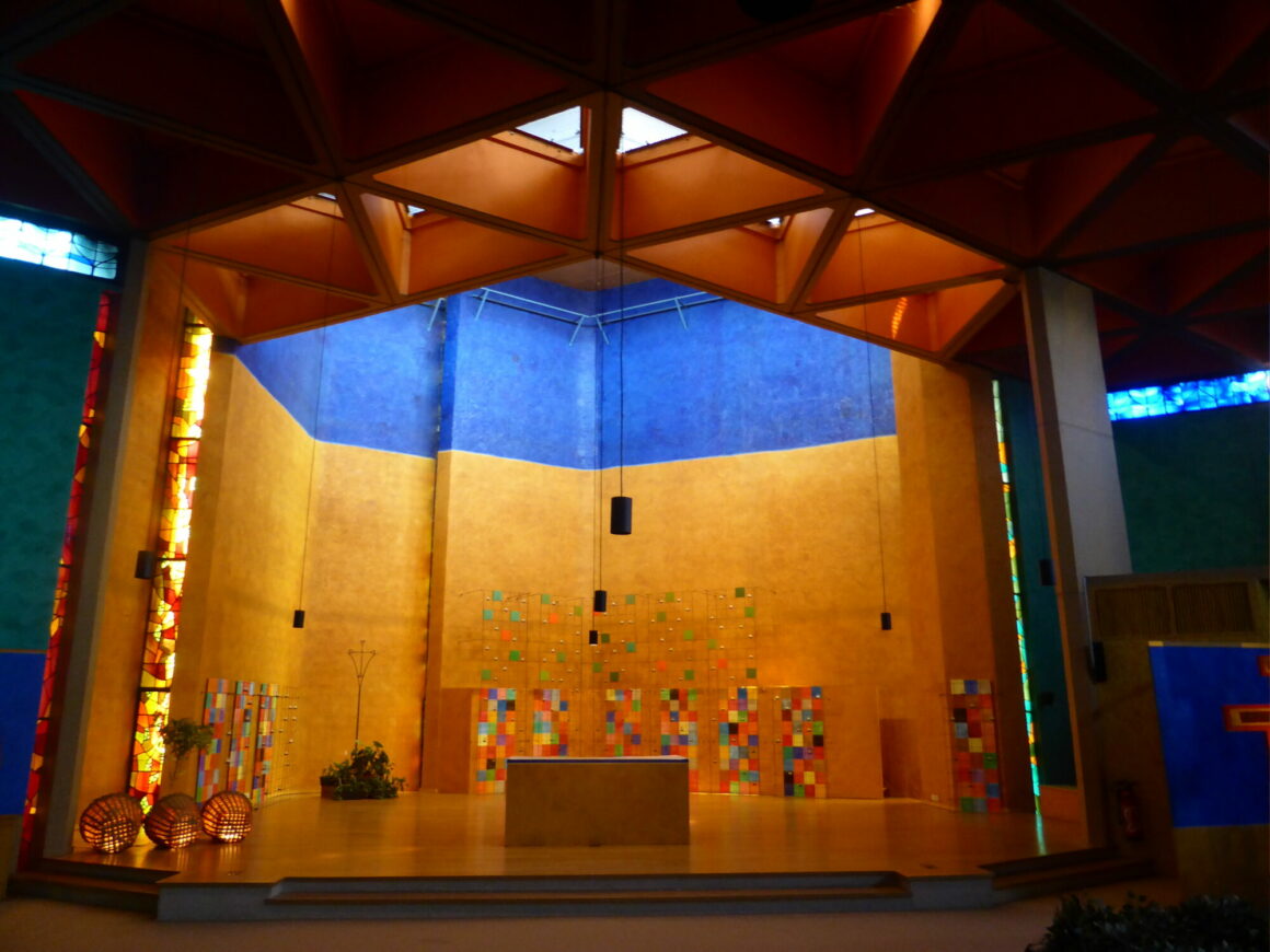 Nous retraversons le site pour nous rendre à l’église de la Réconciliation. Sous un préau, un petit groupe de jeunes et quelques accords de guitare. Je goûte ce furtif signe de “l’ambiance Taizé” dont mes filles m’avaient parlé avec enthousiasme au retour d’un séjour de groupe, il y a déjà pas mal d’années.