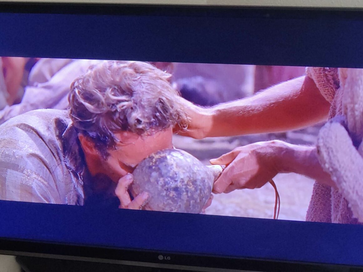 J’étais préoccupée par la pensée du ménage prévu et plus que nécessaire cet après-midi, quand mon fils m’a envoyé en forme de clin d’œil une photo de son écran de télévison : il zappait, et sur Arte, il tombe pile sur une scène mémorable de Ben-Hur qu’il m’envoie promptement sans rien m’en dire, mais que j’ai bien sûr reconnue aussitôt : cet instant central dans le film où Jésus de Nazareth, que l’on ne fait que deviner, donne à boire à Judah Ben-Hur, enchaîné comme galérien et harassé sous le soleil.