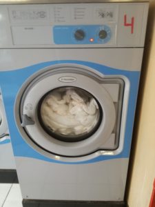 Quand c’est occasionnel, la laverie, c’est plutôt amusant. Il y a là des femmes qui attendent patiemment que leur machine ait fini de ronronner en faisant des mots fléchés ou en lisant une revue. Il y a des messieurs impatients qui disparaissent le temps que le lavage se fasse. D’autres, perdus, qui sollicitent les conseils de ces dames. Et puis il y a une ravissante petite fille qui accompagne son papa et qui contemple avec des yeux pleins d’envie la peluche géante de ma fille qui se fait ballotter dans le tambour du sèche-linge.
