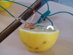 Il fallait les voir, affairés autour d’une dizaine de citrons, à planter dans la chair acide des rondelles de zinc et de cuivre, à les relier les uns aux autres avec des câbles électriques dans l’espoir fou que la LED finisse par s’allumer. Pas facile de tomber sur l’idée de construire un circuit en série. Il aura fallu une démonstration de l’animatrice pour les aiguiller vers la bonne solution et se prouver à eux-mêmes qu’un citron pouvait servir de pile. Joie de l’expérimentation, lumière dans tous les yeux quand enfin la LED s’allume !
