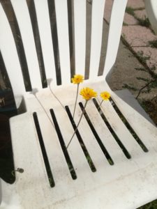 Ce matin, me promenant dans mon jardin à la recherche de beautés épanouies ou en promesse, je suis passée presque trop vite devant le recoin le plus négligé des abords de ma maison. Il y a là de vieux pavés mal désherbés et un fauteuil de jardin passé du blanc au gris que j’ai abandonné aux herbes folles. Et surprise : trois fleurs jaune soleil s’étaient frayé un chemin à travers les fentes de la chaise de jardin ! La beauté dans la disgrâce, la vie dans l’abandon, du neuf dans le vieux, des couleurs éclatantes dans le terne de l’usure.