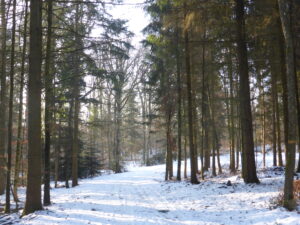 Mon milieu de prédilection, c’est indiscutablement la forêt. Là, je ne crains aucun mal, je fais fi des sangliers que je pourrais croiser aux détours d’un sentier et je me réjouis comme une enfant quand j’aperçois entre les fourrés un chevreuil ou une harde de cerfs. C’est la récompense suprême de toute promenade dans le silence. Je n’ai jamais pu emménager dans un logis d’où je ne voie pas des arbres depuis mes fenêtres. Et chez moi, je dois dire que je suis très gâtée : la forêt vosgienne encercle mon village et est la toile de fond de mon paysage, où que je me tourne. Elle est là, avec ses conifères immenses et ses feuillus touffus, ajoutant au plaisir des couleurs en toutes saisons celui de senteurs discrètes, de l’air pur et des sommets courbes du massif vosgien. Les promenades sont un peu ardues parfois, les sentiers raides, mais je ne me sens jamais aussi bien quand dans cette cathédrale des arbres, comme j’aime à la nommer, plongeant moi aussi mes racines dans un sol riche et tendant mes branches vers l’infini du ciel. La forêt, c’est mon milieu, mon poumon, mon oxygène, le lieu privilégié aussi de ma méditation silencieuse quand je reviens mille et une fois sur les mêmes sentiers. Au détour des chemins, on découvre des calvaires, signes de la prière de beaucoup d’autres avant nous. Et là, je pense au cantique spirituel de saint Jean de la Croix, même si Jésus n’a jamais concrètement arpenté mes petits chemins forestiers :