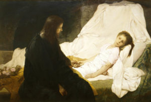 Il saisit la main de l’enfant, et lui dit : « Talitha koum », ce qui signifie : « Jeune fille, je te le dis, lève-toi ! »