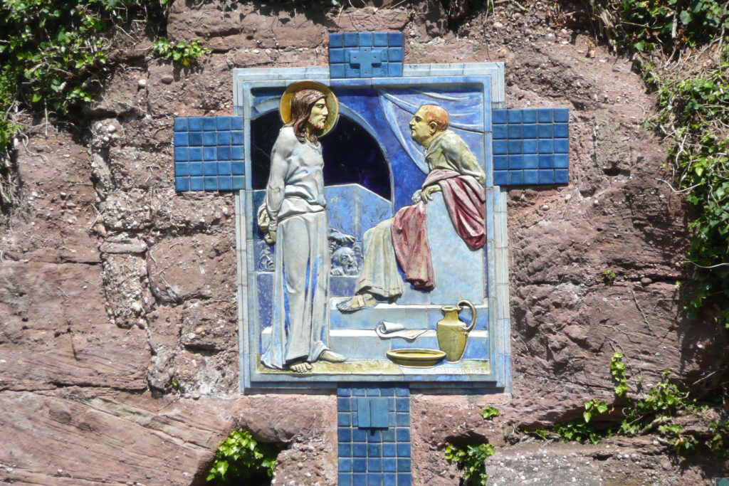 Image : 1ère station du Chemin de Croix du Mont Sainte Odile, céramique de Léon Elchinger, Jésus devant Pilate